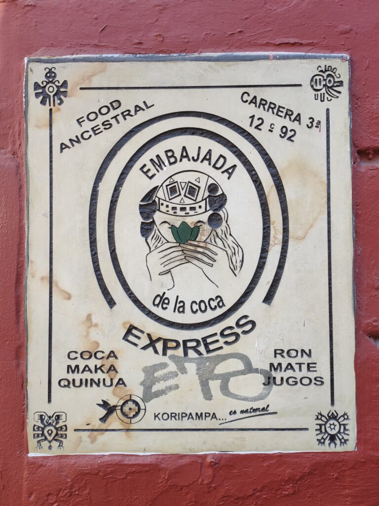 Per “sgrassare” e combattere il jetlag, ci siamo diretti all’Embajada de la Coca a La Candelaria. Abbiamo provato il tè di coca e una fetta di torta di coca. Nico non ha resistito e ha assaggiato anche un distillato artigianale di foglia di coca, un apprezzatissimo digestivo locale.